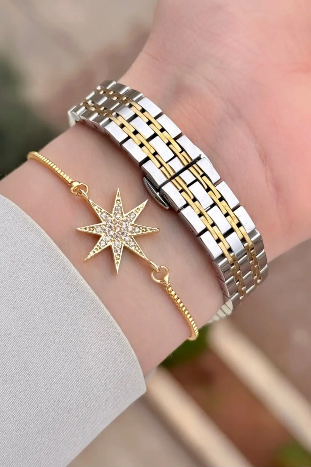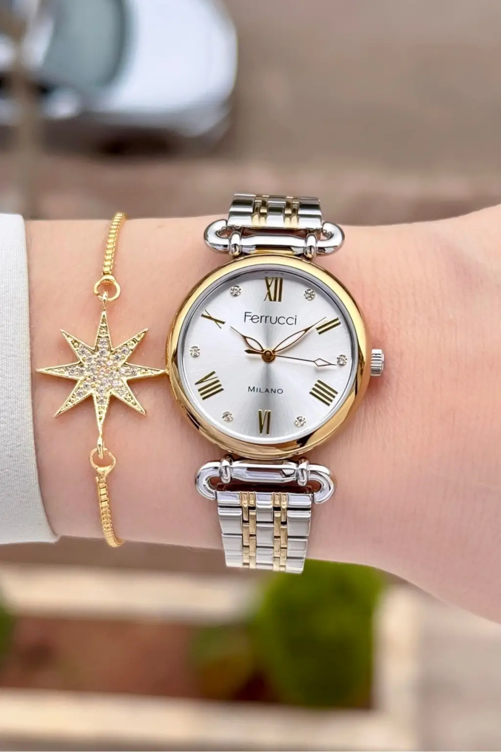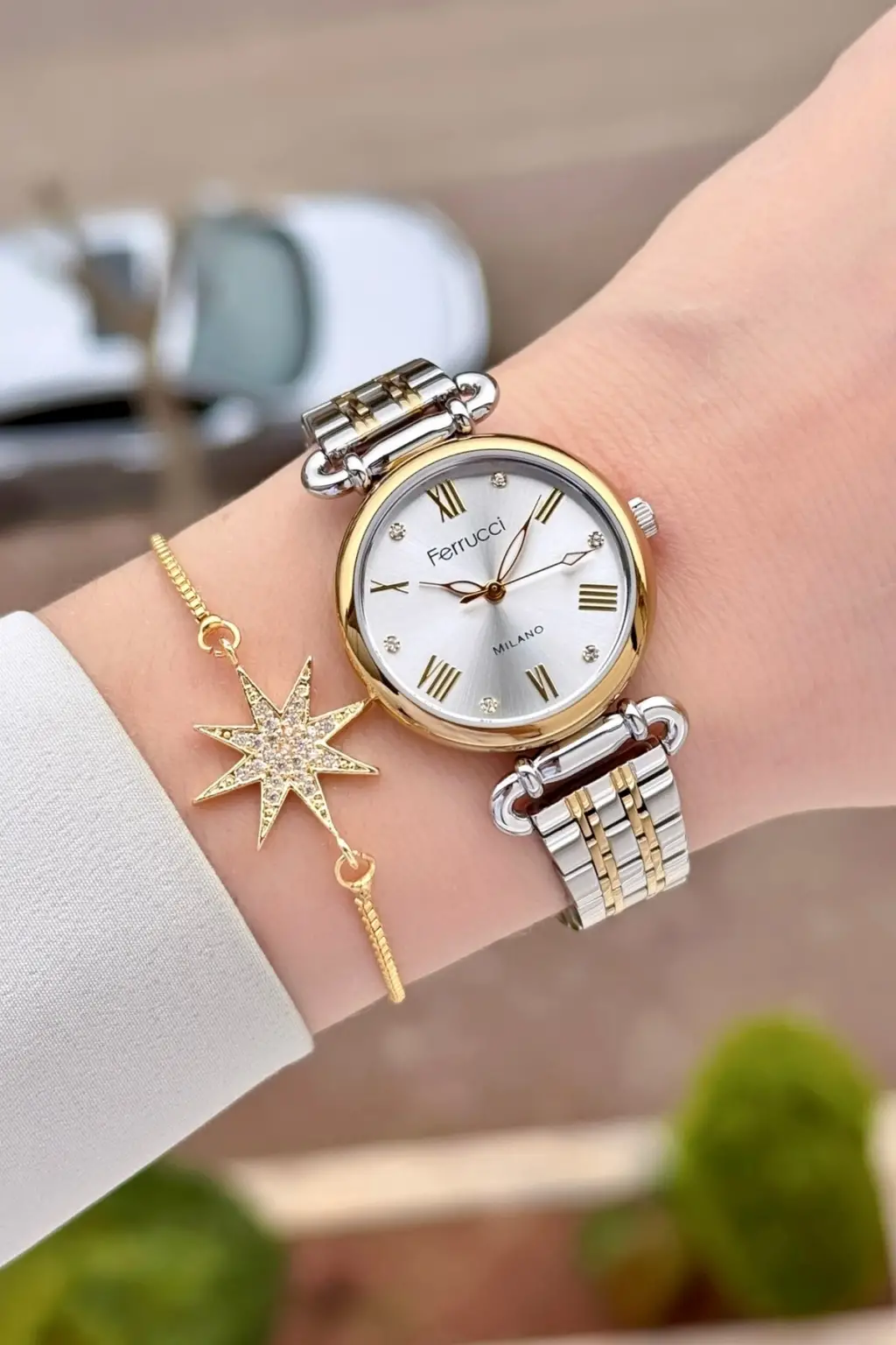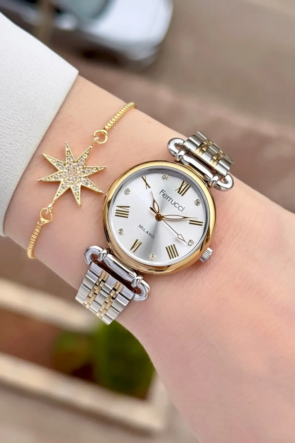 Gold Gümüş Renk Kadın Kol Saati ve Bileklik