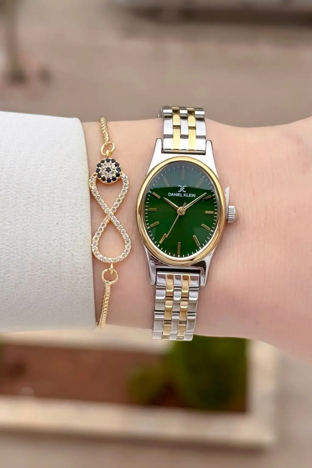 Gold Gümüş Yeşil Renk Hediye Paketli Kadın Kol Saati ve Bileklik