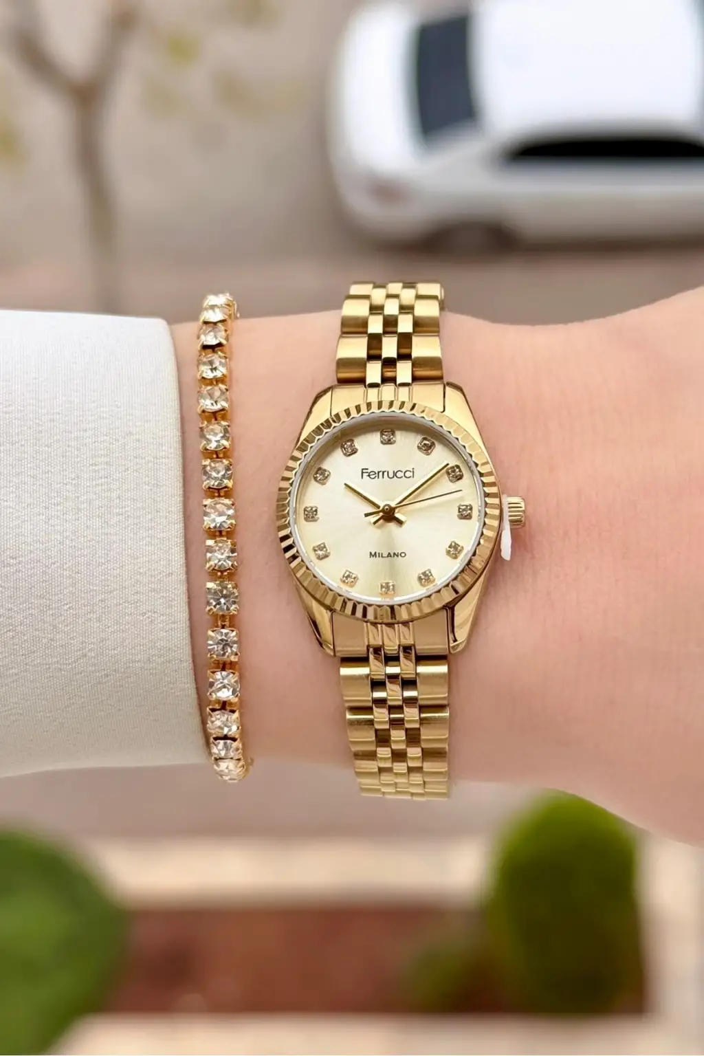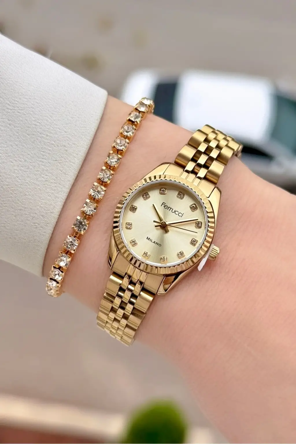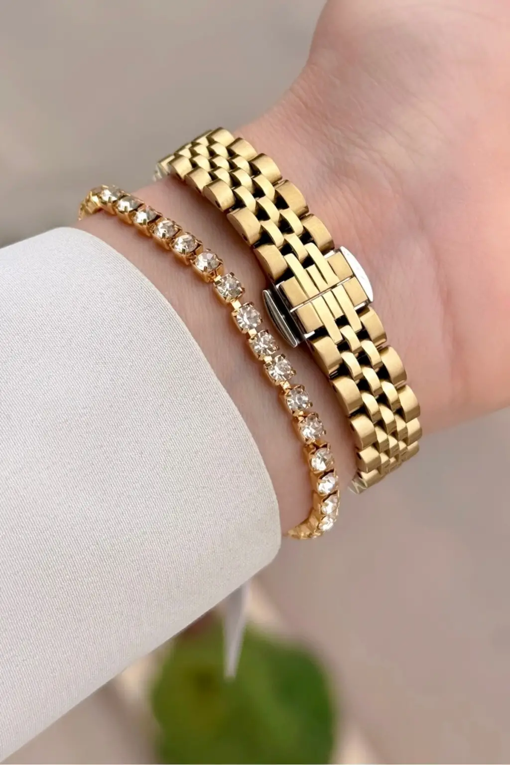 Gold Renk 24 Mm Tam Çelik Paslanmaz Kadın Kol Saati ve Bileklik