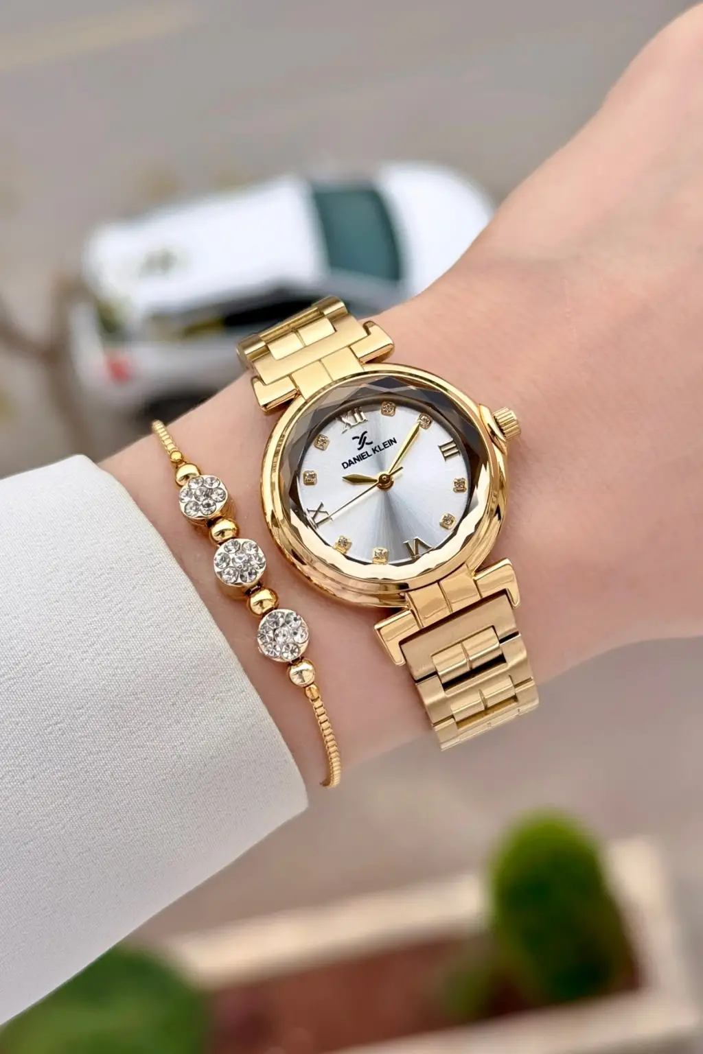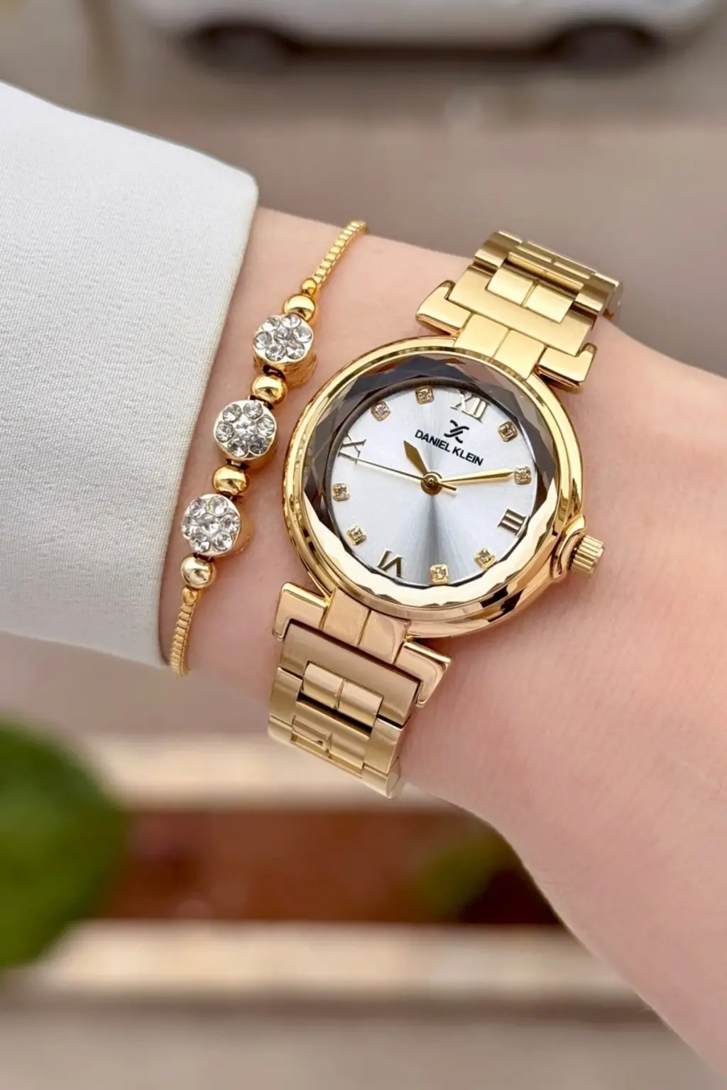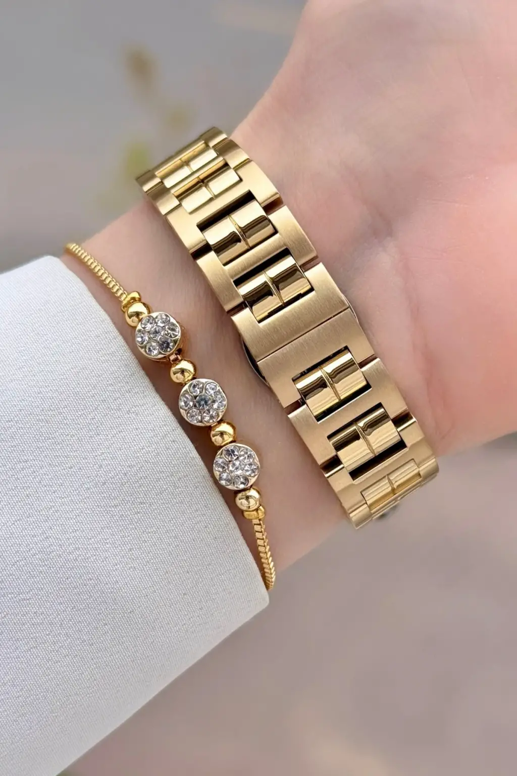 Gold Renk 30 Mm Kristal Cam Kadın Kol Saati ve Hediye Bileklik
