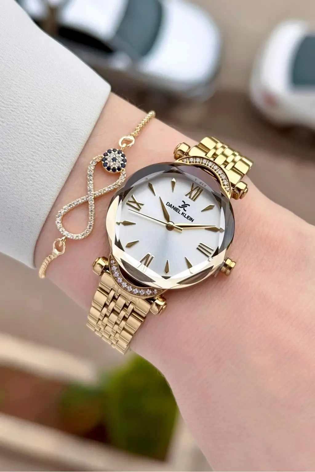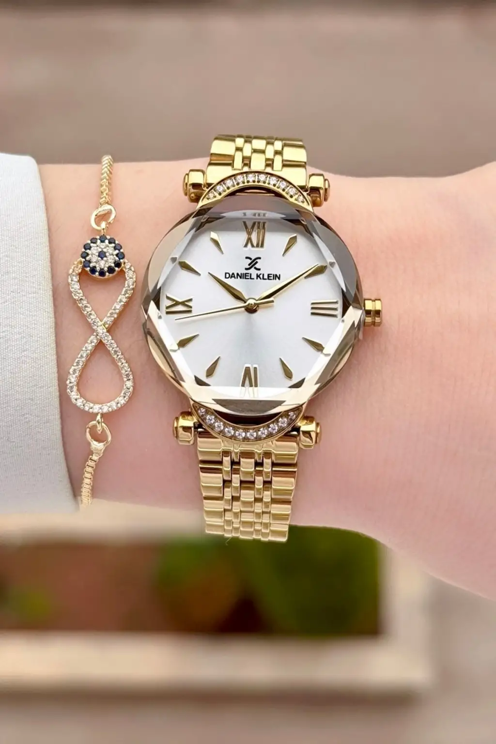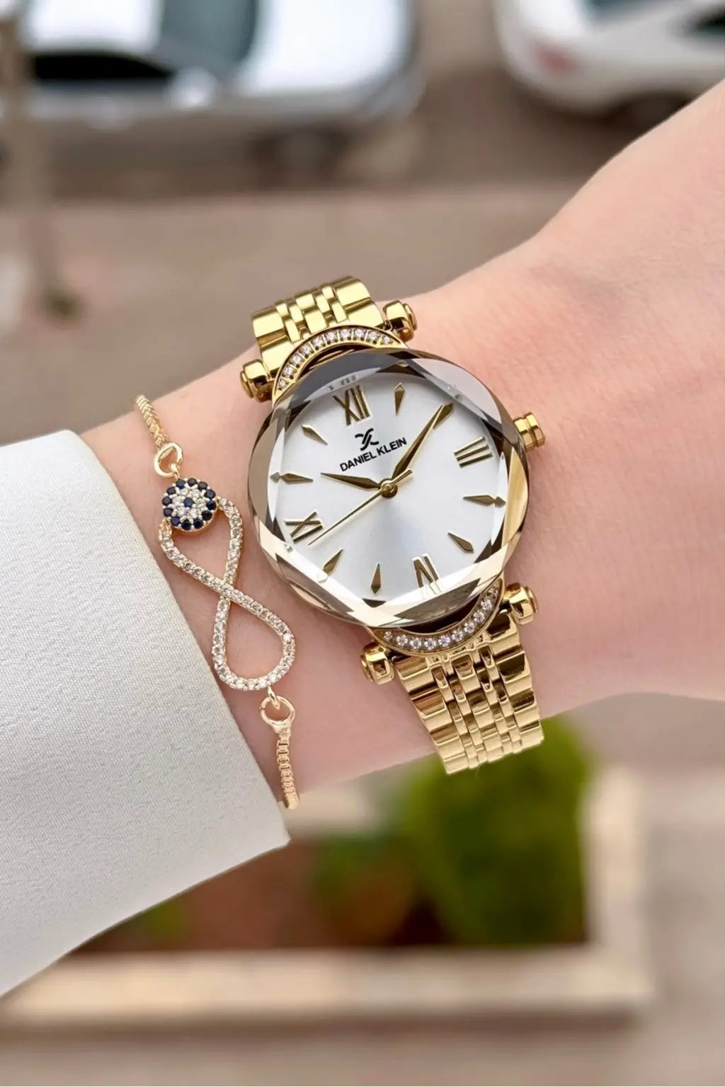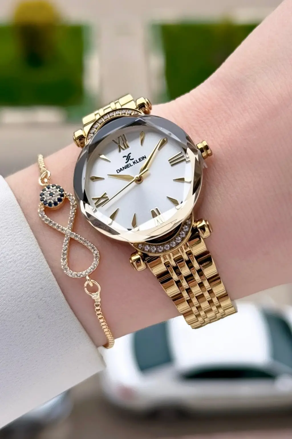 Gold Renk Kesme Camlı Kadın Kol Saati Ve Bileklik