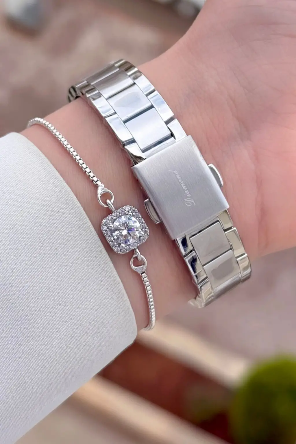 Gümüş Renk 30 mm Hediye Paketli Kadın Kol Saati ve Hediye Bileklik