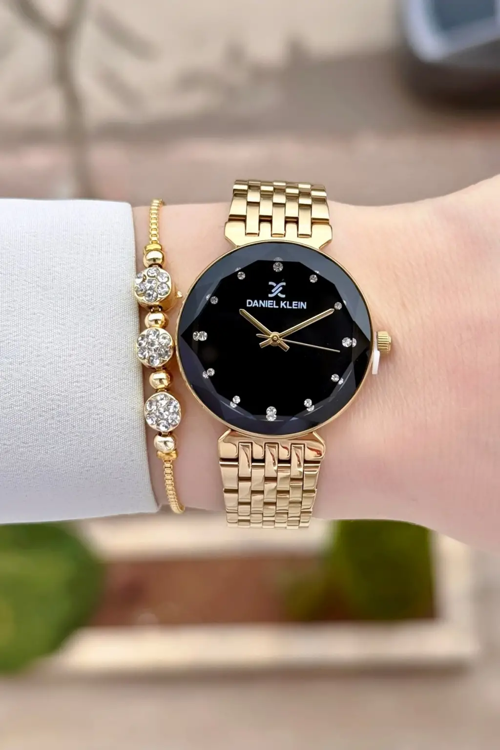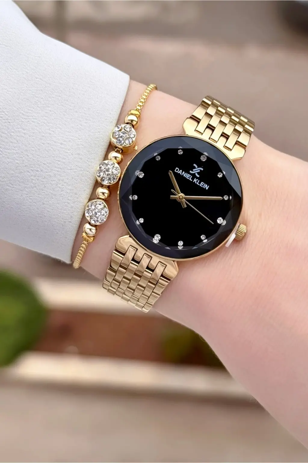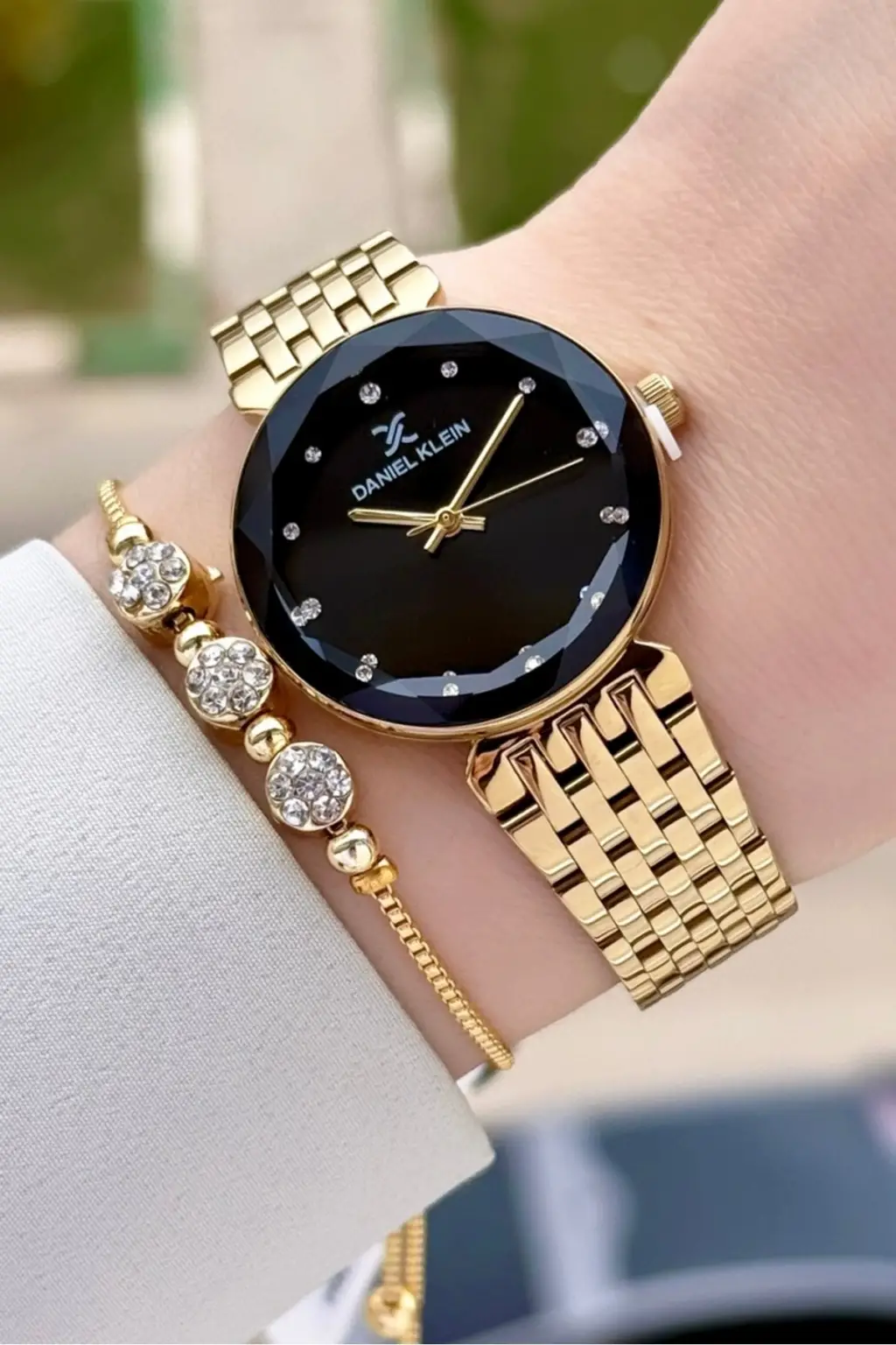 Kadranı Siyah Kordonu Gold Renk 30 mm Kadın Kol Saati ve Bileklik