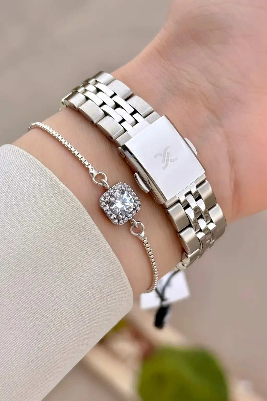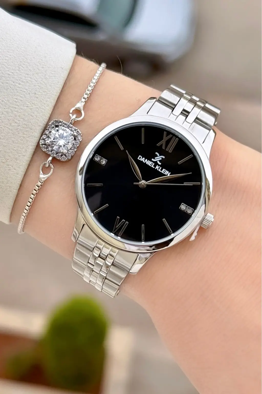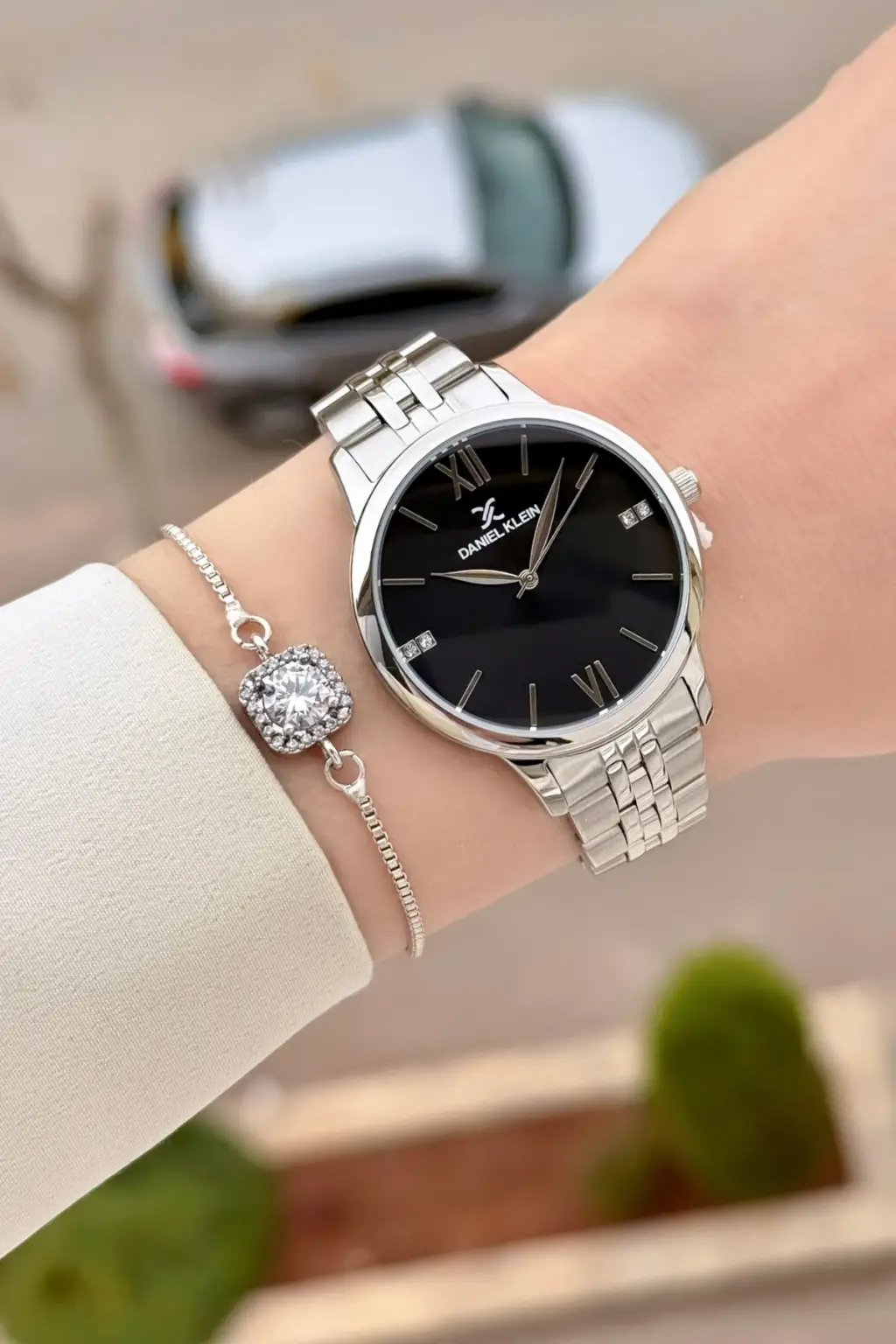 Kadranı Siyah Kordonu Gümüş Renk 35 mm Kadın Kol Saati ve Hediye Bileklik