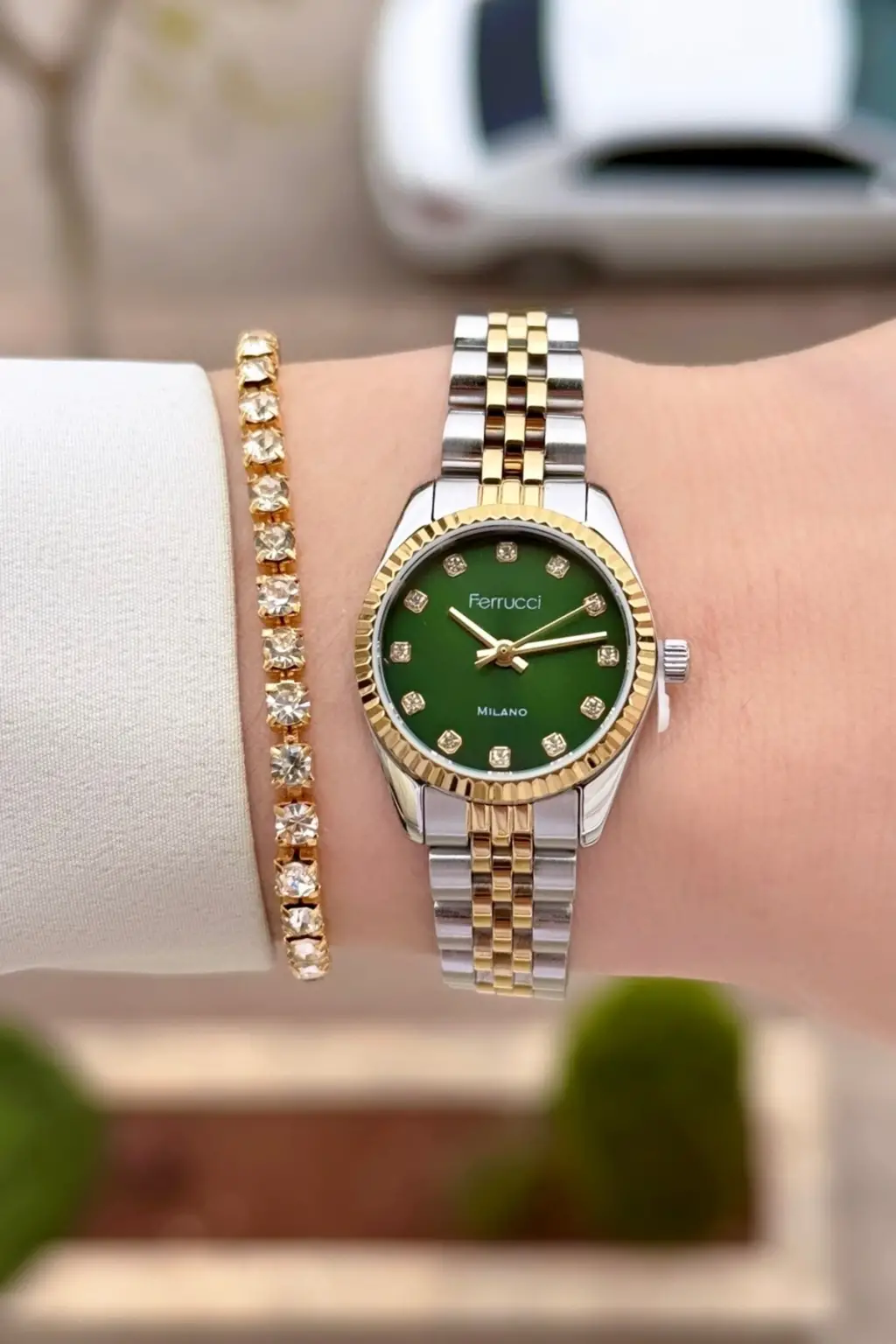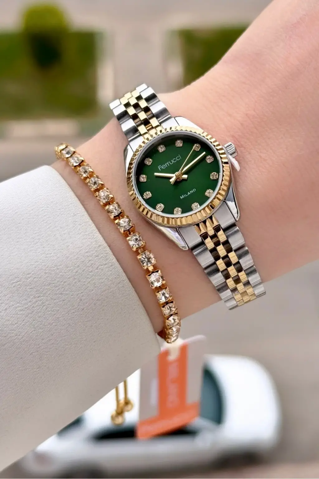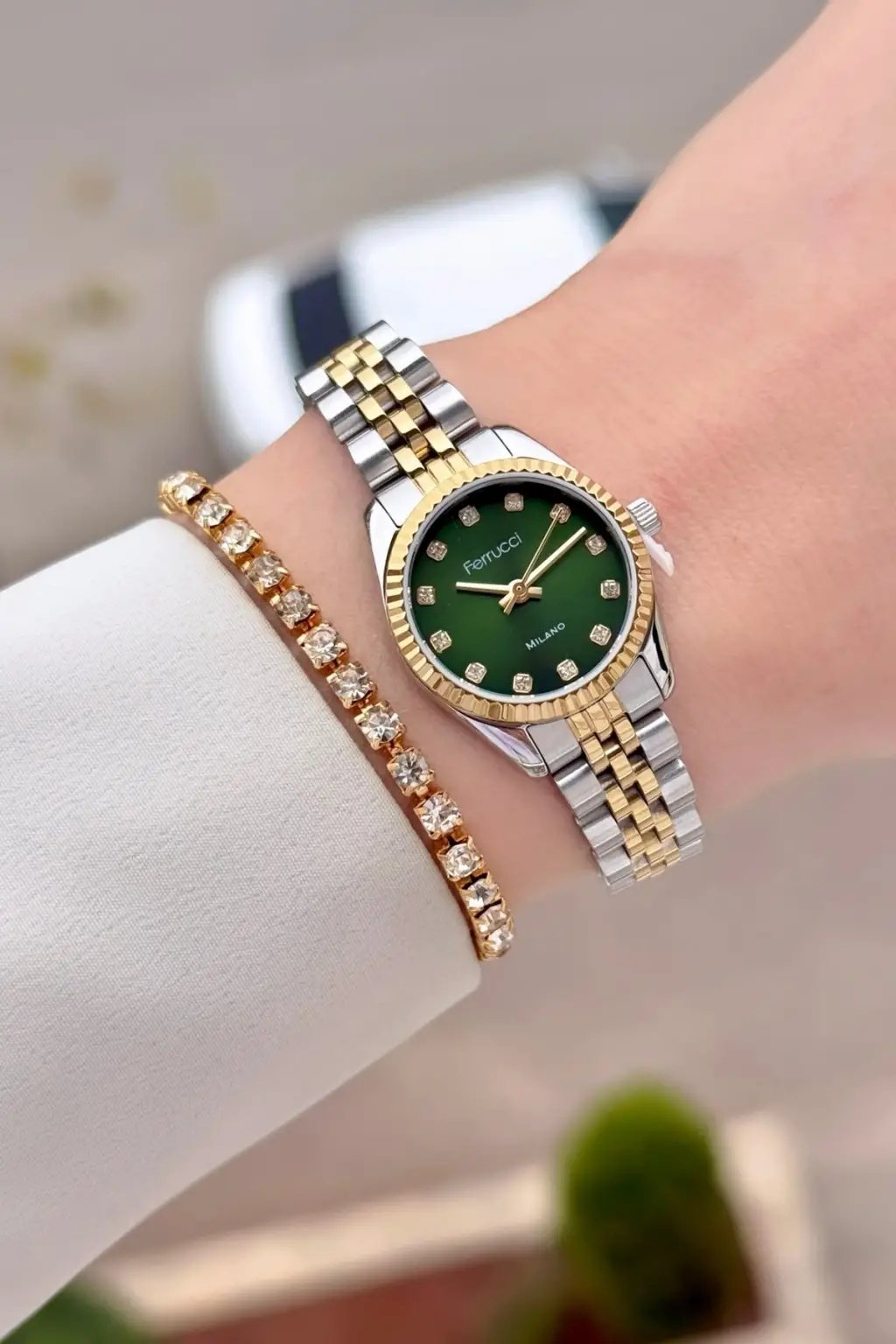 Kadranı Yeşil Kordonu Gold Gümüş Renk 24 Mm Tam Çelik Paslanmaz Kadın Kol Saati ve Bileklik