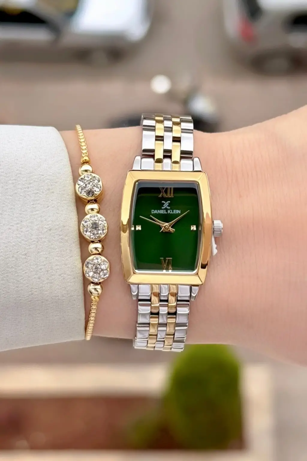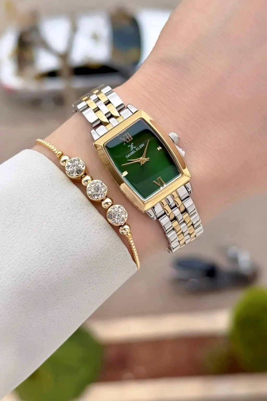 Kadranı Yeşil Kordonu Gold Gümüş Renk 26 mm Kadın Kol Saati ve Hediye Bileklik