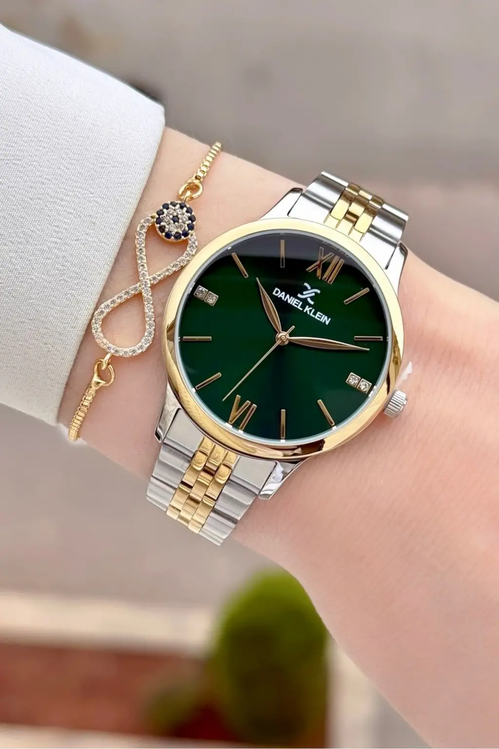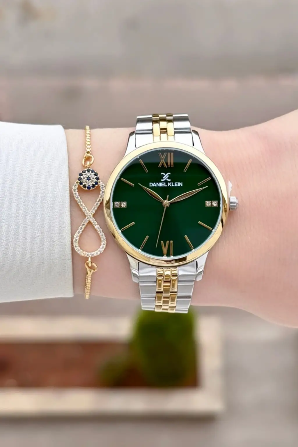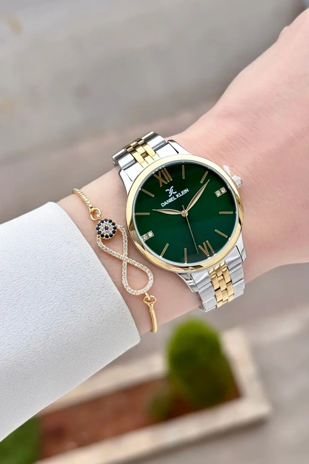 Kadranı Yeşil Kordonu Gold Gümüş Renk 35 mm Hediye Paketli Kadın Kol Saati ve Bileklik