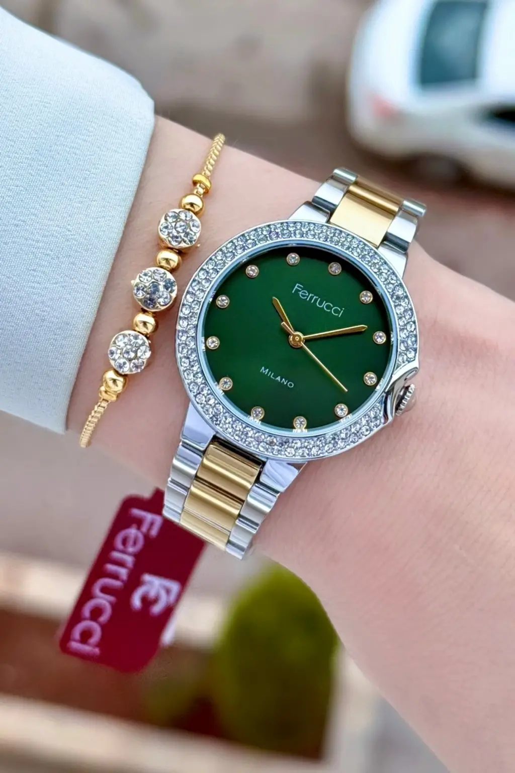 Kadranı Yeşil Kordonu Gold Gümüş Renk Kadın Kol Saati ve Bileklik