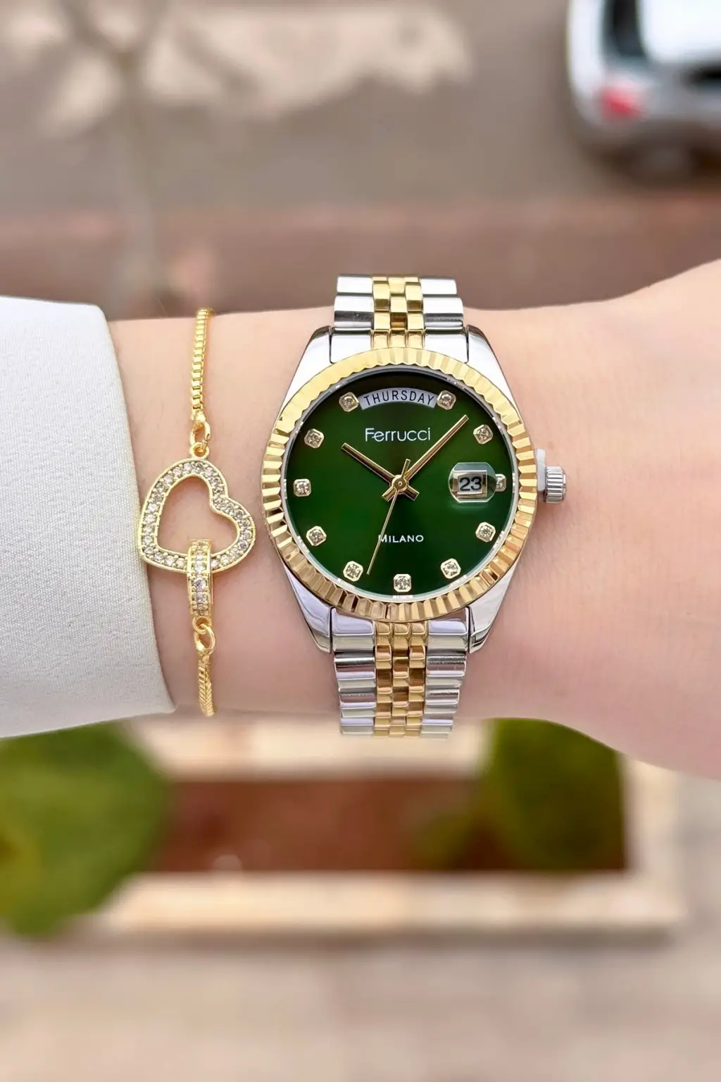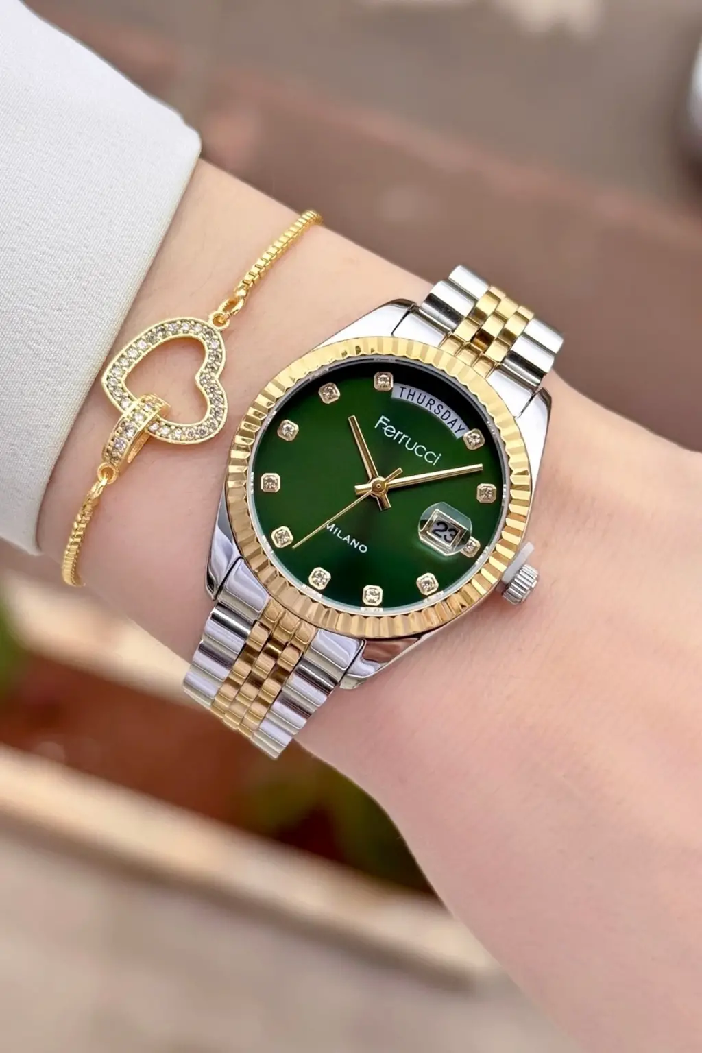 Kadranı Yeşil Kordonu Gold Gümüş Renk Takvimli Kadın Kol Saati ve Bileklik