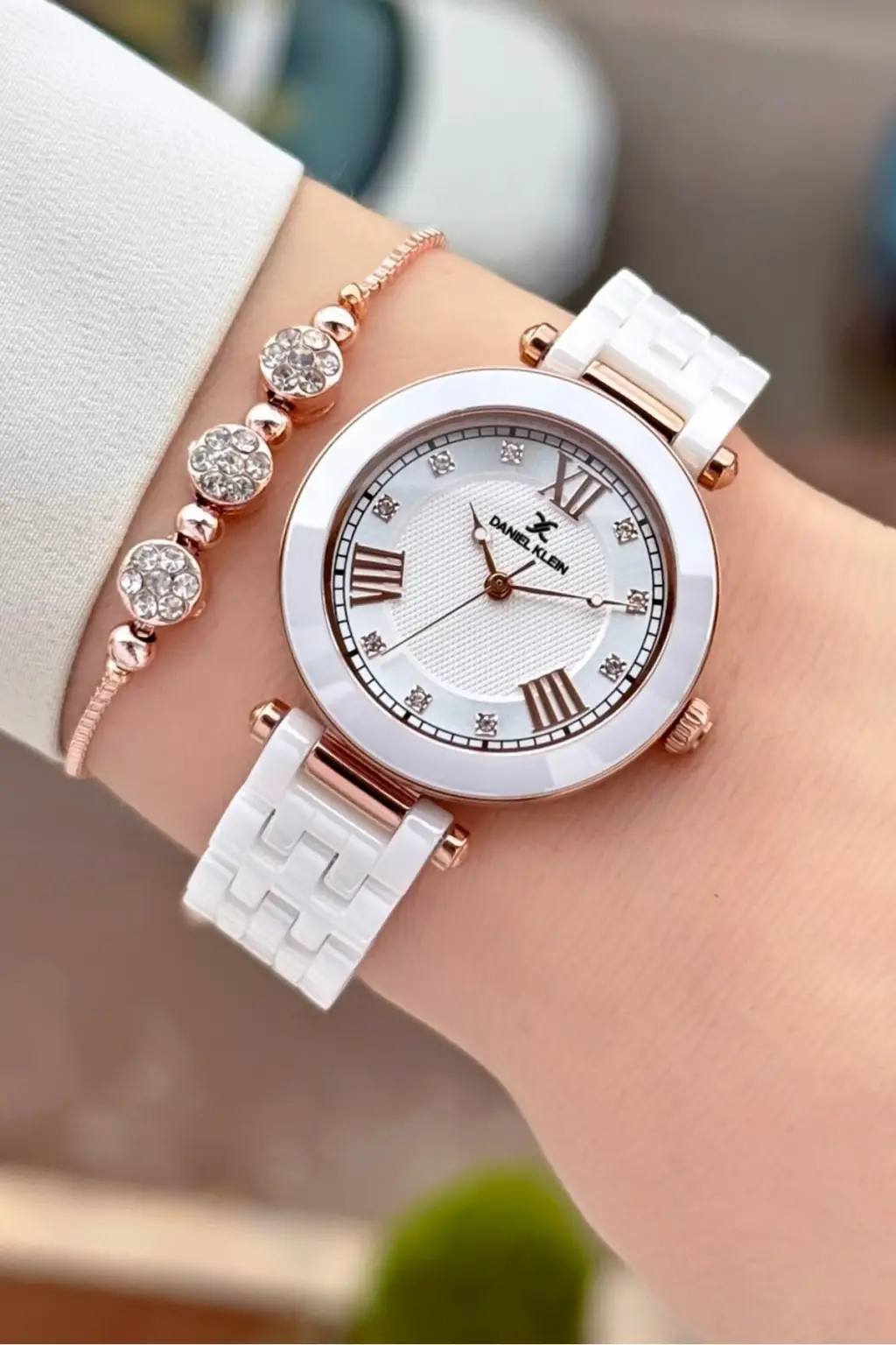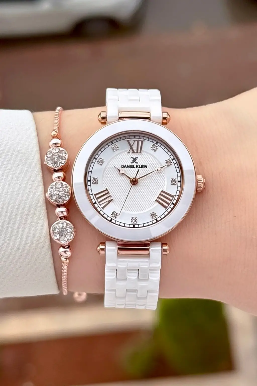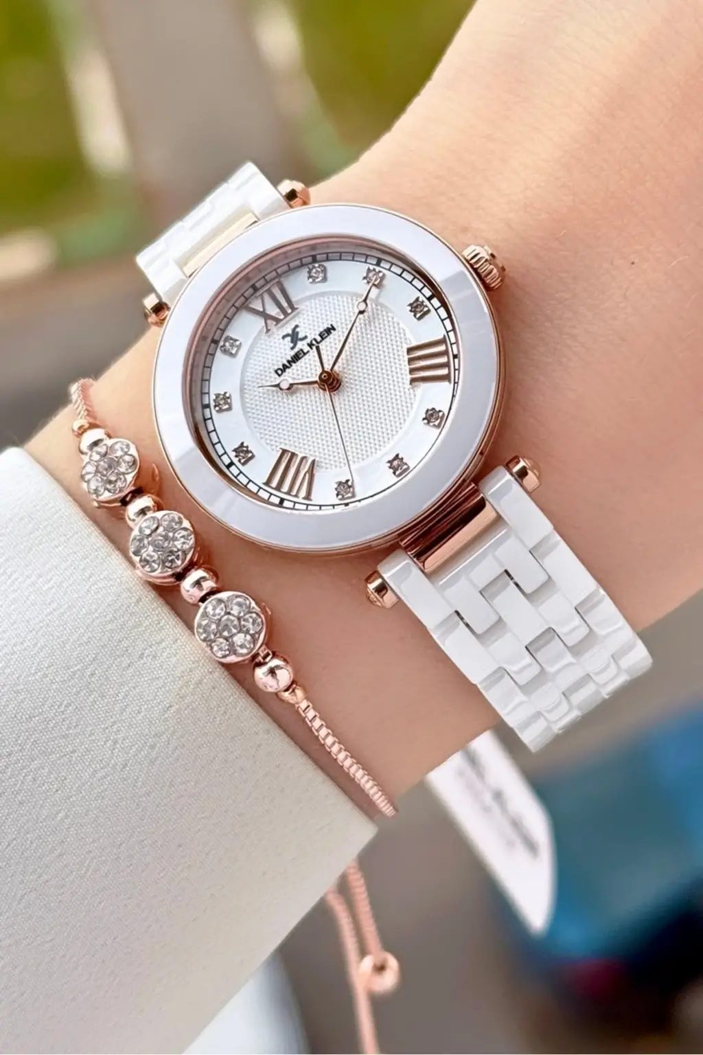 Kasası Rose Kordonu Beyaz Renk 32 mm Seramik Kadın Kol Saati ve Bileklik