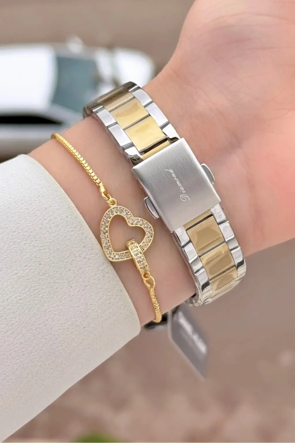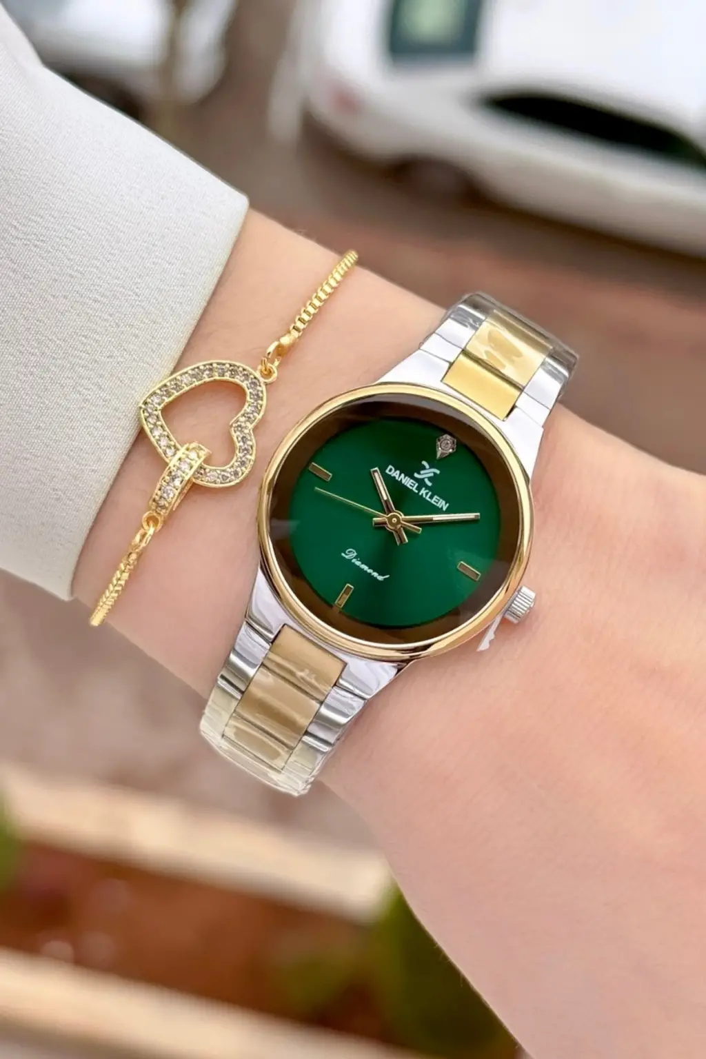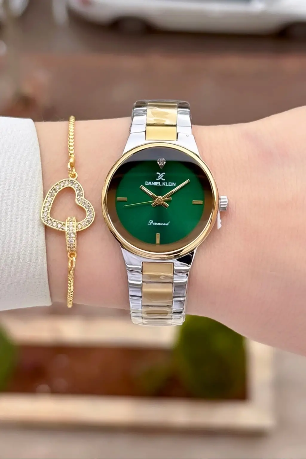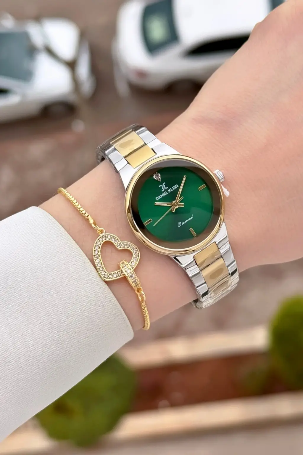 Pırlantalı Kadranı Yeşil Kordonu Gold Gümüş Renk 30 mm Hediye Paketli Kadın Kol Saati ve Bileklik