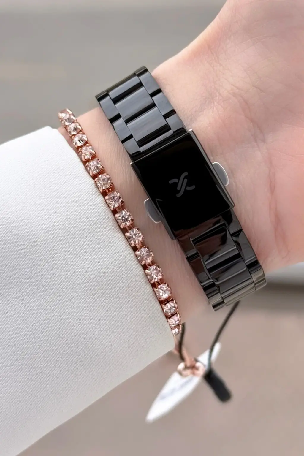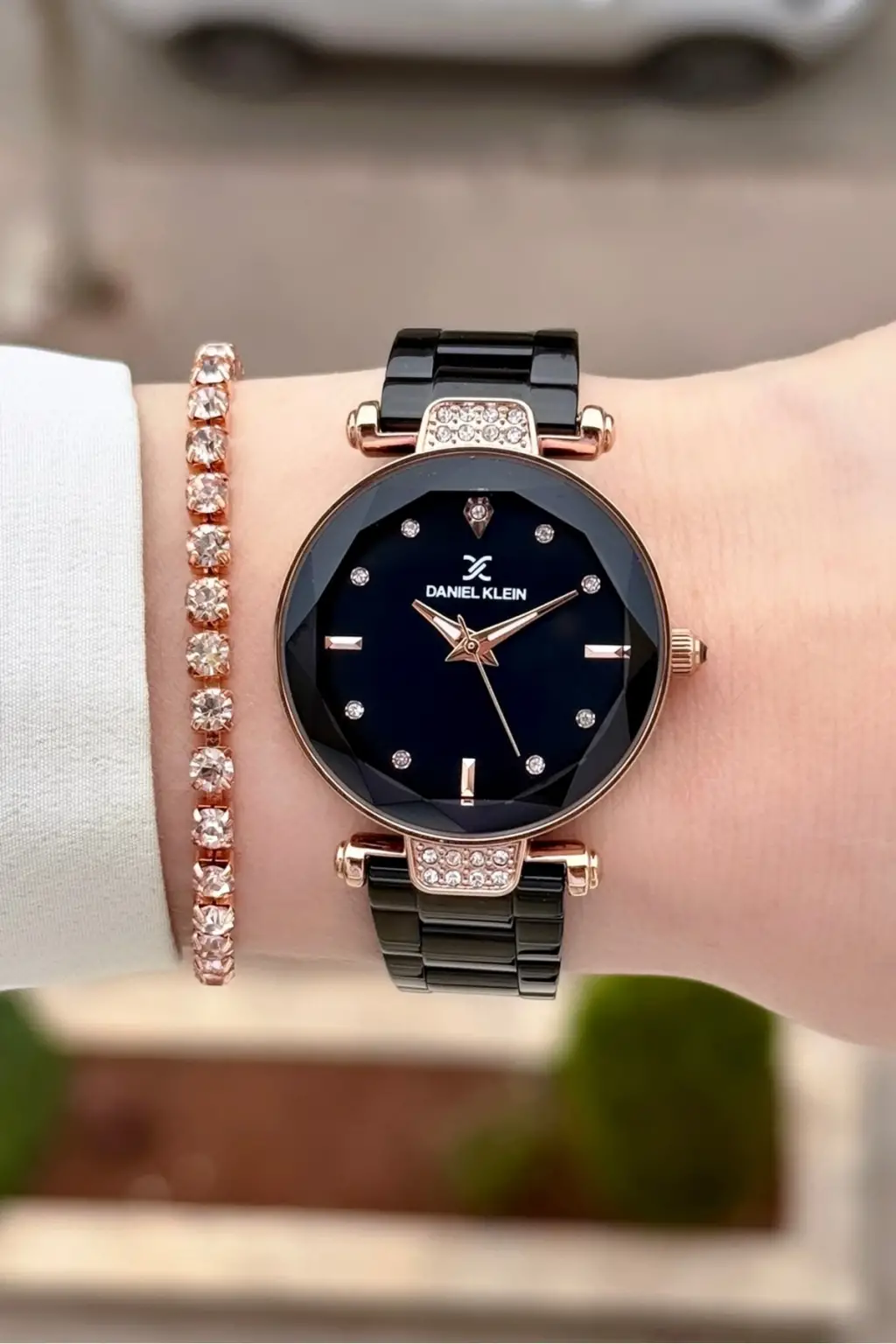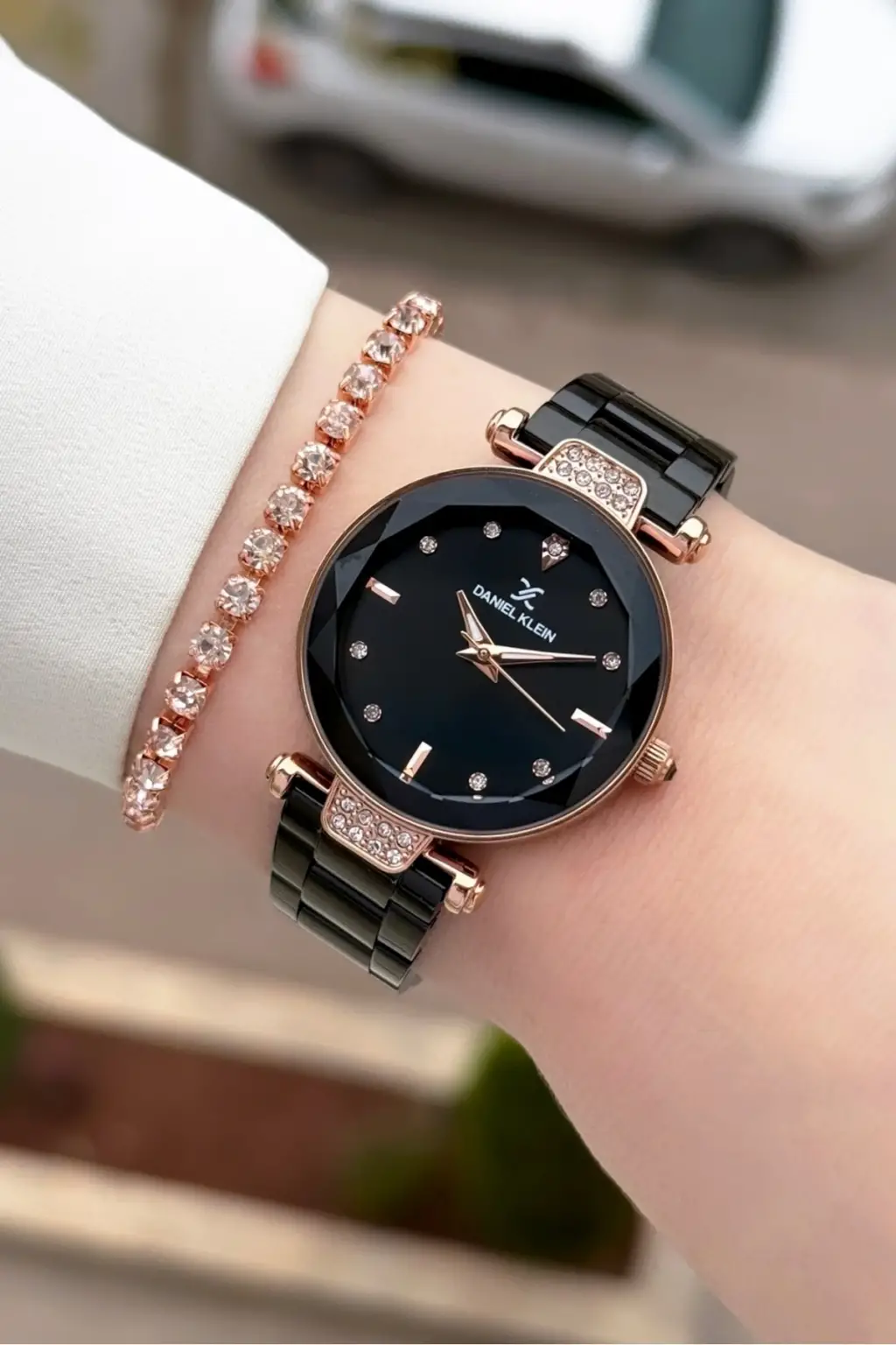 Rose Siyah Renk Kesme Camlı Kadın Kol Saati ve Bileklik